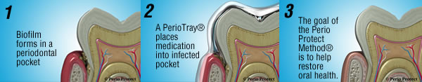 The Perio Protect Method® is an effective, sensible approach to treat bacteria that cause gum disease. At the heart of the Method is the adjunctive Perio Tray® delivery of medication. The basic idea is to get medication under the gums and into the pockets where bacteria grow and keep it there long enough for the medication to work, all in a comfortable, non-invasive way. Not a simple task. That's why the Perio Tray is such an important advancement.
